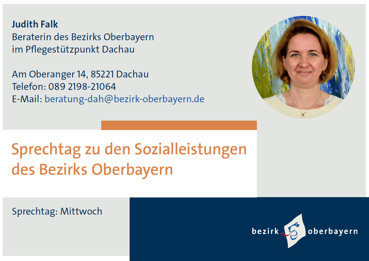 Der Bezirk Oberbayern ist für die Bürgerinnen und Bürger im Landkreis Dachau wohnortnah erreichbar: Beim wöchentlichen Sprechtag im Pflegestützpunkt beraten wir vertraulich und kompetent zu unseren sozialen Leistungen. Unsere Beratung vor Ort richtet sich an Menschen mit Pflegebedarf und Menschen mit Behinderungen sowie deren Angehörige.